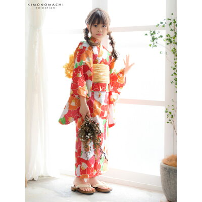 レトロでかわいい浴衣をぜひお楽しみください!サイズ 110 120 130 140 150ごくごく淡いクリーム色地に、明るい赤、オレンジ、水色などの色使いの椿のお花が重なりあった模様。
