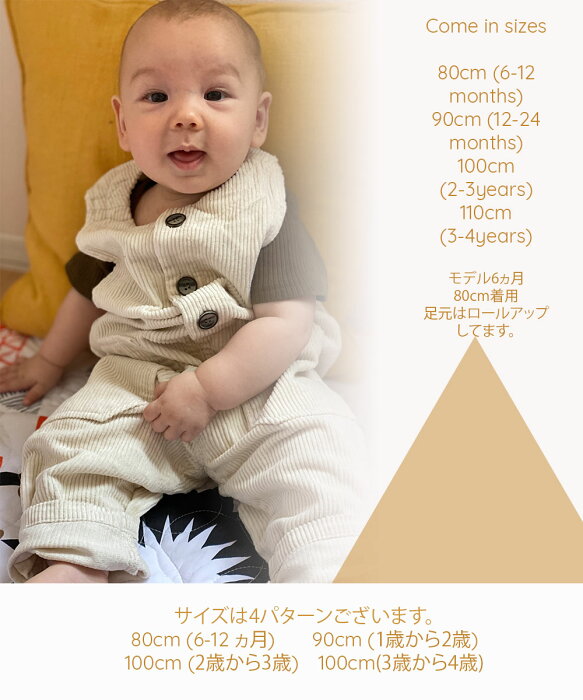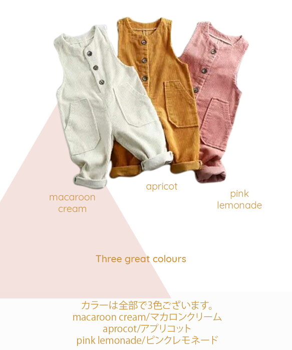 商品説明素材コットン100% サイズ80cm90cm100cm110cm特徴 コットン100%のコーデュロイオーバーオールです。