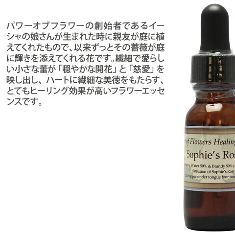 広告文責 (株)B-CRUISE(0362724460) キーワード Sophies Roseパワーオブフラワーヒーリング その他シングルエッセンス ソフィーローズ ハートに繊細な美徳をもたらす その他シングルエッセンス 1970年代よりフラワーエッセンスの研究を続けてきたイーシャ・ラーナー氏がエッセンスを作る為にふさわしい花を求めて7年間に渡って探索の旅をし、すべての条件を満たした、おもにオレゴン州カスケード山脈やハワイ諸島に咲く、自然環境がおかされていない野生の花から作られたエッセンスです ハートに繊細な美徳をもたらす パワーオブフラワーの創始者であるイーシャの娘さんが生まれた時に親友が庭に植えてくれたもので、以来ずっとその薔薇が庭に輝きを添えてくれる花です。