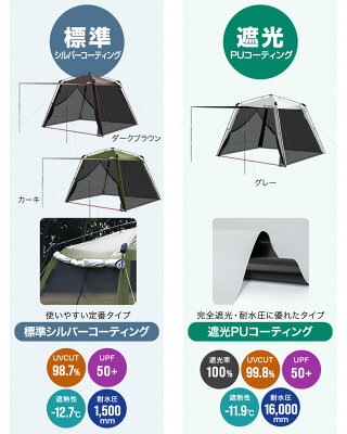 ※[店舗管理用 URL]a11938※[品番]【ダークブラウン/本体のみ:a16859】【ダークブラウン/シート1枚付き(+1,100円):a16861】【ダークブラウン/シート2枚付き(+2,200円):a16862】【カーキ/本体のみ:a16860】【カーキ/シート1枚付き(+1,100円):a16863】【カーキ/シート2枚付き(+2,200円):a16864】 面倒なフレームの組み立て不要! 広げて立ち上げるだけのカンタン設営! 広げて脚を伸ばすだけでカンタンに設営ができる! ポールを通すなど組み立てる作業が無いので、 設営時間を短縮したい方や、女子キャンプにもオススメ! ゆったり広々サイズで快適空間 285cmサイズのメッシュスクリーンテント 285cm×285cmサイズのスクリーンテントです。