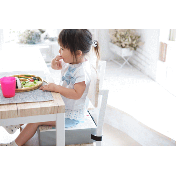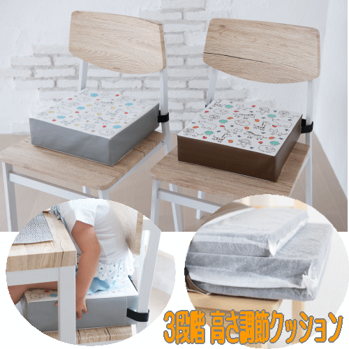 高さが3段階に調節できる便利なお子さま用のお食事クッション! ■大人用のイスに乗せるだけ 大人用のイスがお子様用のイスに大変身! ■低反発ウレタンで高さを調節! 2枚の低反発ウレタンを使用しています。