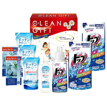 クリア洗剤詰合せギフト 皮脂を原因とする汗、ニオイなどの見えない汚れやドロ汚れを落とし清潔感のあるクリアな洗いあがりのトップクリアリキッドや除菌成分配合の食器洗剤などを詰め合わせました。