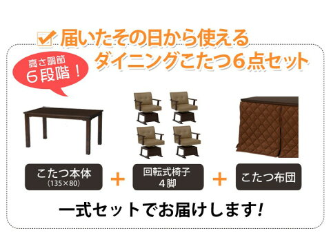 お買い物ガイド 届いてすぐにあったか6点セット! ▼セット内容▼ ・ダイニングこたつ幅135cm ・こたつ掛ふとん幅135cm対応 ・360度回転こたつ椅子4脚 <こたつ> ■サイズ:(約)幅135×奥行80×高さ70(65・60・55・50・45)cm ■素材: 天板:オーク突板、ウレタン樹脂塗装 ■仕様: 石英管ヒーター(2灯式)600W、手元電子コントローラー式 ■生産国:マレーシア <布団> ■サイズ:(約)幅135×奥行80×高さ70cm ■素材: 表地:ポリエステル100%(ピーチスキン) 中綿:ポリエステル100%(東レ マッシュロン使用) 裏地:スリットコーナー:ポリエステル100%(ピーチスキン) ■生産国:中国 ■リモコン用ポケット付き、洗濯機OK <椅子> ■サイズ:(約)幅56×奥行54×高さ高さ68.5・73.5(座面高:35.5・40.5)cm ■素材: フレーム:ラバーウッド、ラッカー塗装 張材:合成皮革 ■生産国:ベトナム商品スペック 【こたつ本体】 ■サイズ(約) 幅135×奥行80×高さ70(65・60・55・50・45)cm [※継脚10・10・5cm付き] ■素材 天板:オーク突板、ウレタン樹脂塗装 ■仕様 石英管ヒーター(2灯式)600W、手元電子コントローラー式 省エネ機能、人感センサー付き ■生産国 マレーシア 商品スペック 【こたつ掛ふとん】 ■サイズ(約) 幅135×奥行80×高さ70cm ■素材 表地:ポリエステル100%(ピーチスキン) 中綿:ポリエステル100%(東レ マッシュロン使用) 裏地:スリットコーナー:ポリエステル100%(ピーチスキン) ■生産国 中国 ■備考 リモコン用ポケット付き、洗濯機OK 商品スペック 【ダイニングチェア】 ■サイズ(約) 幅56×奥行54×高さ高さ68.5・73.5(座面高:35.5・40.5)cm ■素材 フレーム/ラバーウッド、ラッカー塗装、張材/合成皮革 裏地・スリットコーナー:ポリエステル 100%(ボア) ■生産国 ベトナム ▼サイズ違い・この布団に合うコタツやお買得セットもあります▼